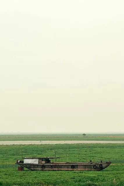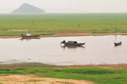 都昌候鳥自然保護(hù)區(qū)磯山保護(hù)站外面,從磯山湖壩上眺望的鄱陽湖:僅余的一道湖水,幾艘無人的漁船,大片裸露湖底變成草洲,延綿至遠(yuǎn)處的小磯山(島)。