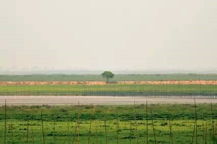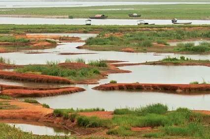 裸露的洲灘和“枯水一線”的湖面景觀。近處排立的竹竿為漁民圍網(wǎng)養(yǎng)魚、養(yǎng)蟹所用。