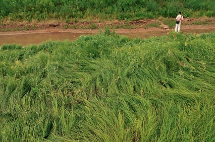 洲灘上的灰化苔草。淹沒后,是鯉、鯽理想的產(chǎn)卵場和育肥場所。苔草是濕生植物,淹沒后進(jìn)入休眠狀態(tài)。因?yàn)楦珊?,今年鯉魚、鯽魚的產(chǎn)卵場將會大規(guī)模減少。