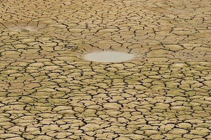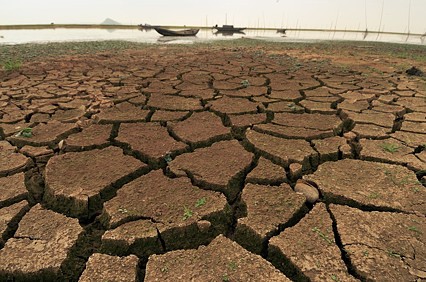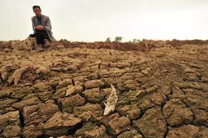 因?yàn)槿彼尸F(xiàn)大片龜裂底泥的魚塘。