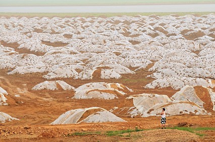 許月華的一位長輩親人坐在魚塘旁邊。在他前面,開裂的泥土里,一條魚被曬得干枯。對于這位長者說,還從未經(jīng)歷過如干旱的初夏季節(jié)。