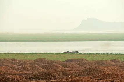 駛往長(zhǎng)江的運(yùn)砂船。遠(yuǎn)處是被聯(lián)合國(guó)教科文組織列入世界文化遺產(chǎn)的鞋山(作為廬山風(fēng)景區(qū)的組成部分,1996年12月),上有七層高的大孤塔。